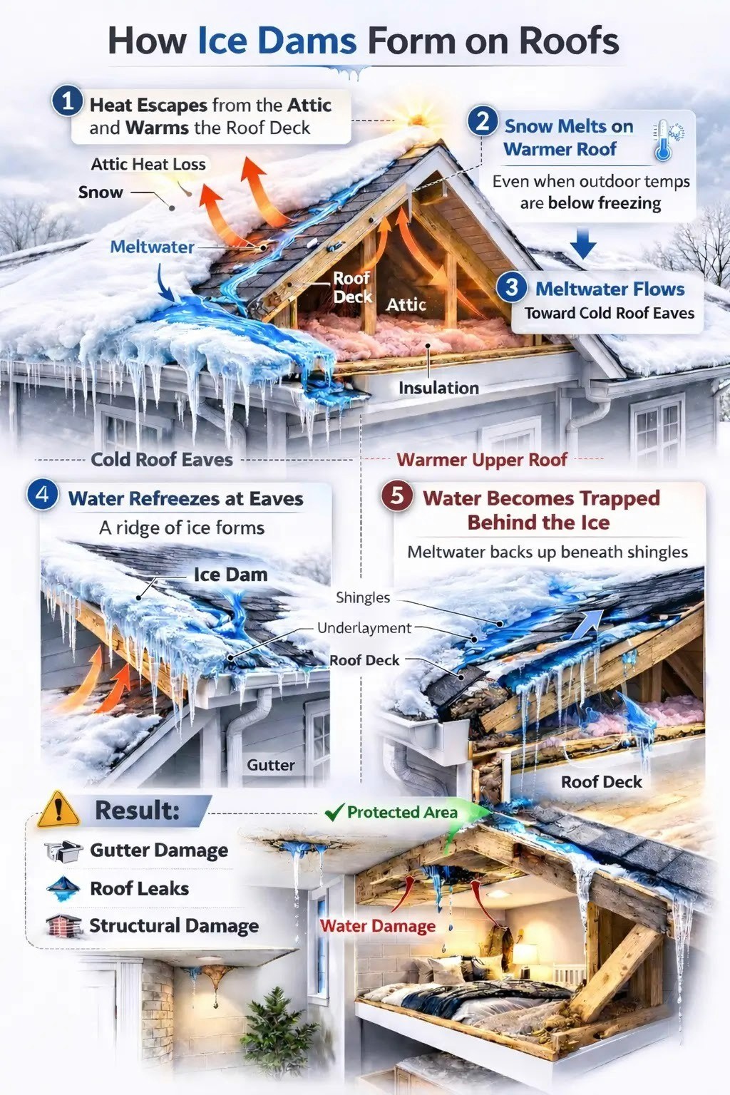 Ice dams trap melting snow and force water beneath shingles and exterior materials.